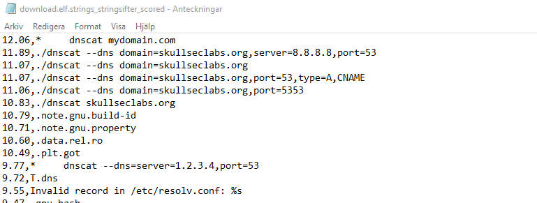 dnscat är ett verktyg liknande en C2 server, det kan användas för att gömma trafik i DNS requests. I vårt fall är det väldigt troligt att denna metod används för att exfiltrara filen som skapas i bash skriptet.