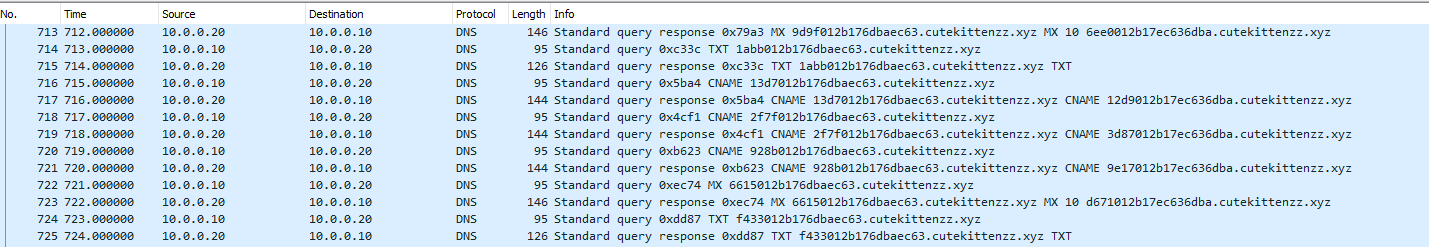 Där ser vi att det är dnscat som gör något! Kollar vi vidare i PCAP filen så ser vi ägen en massa trafik som ser ut så här: