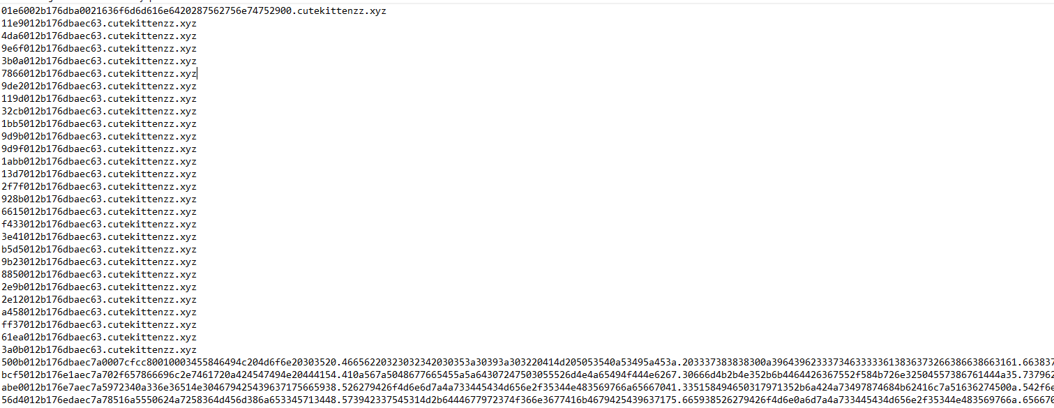 Sedan skapar den en fil att exfiltera och efter det sparar den en lång base64 sträng i en fil döpt till mjau som den kör med argumentet cutekittenzz.xyz.