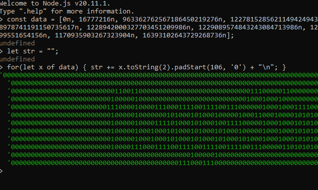 const data = [0n, 16777216n, 963362762567186450219276n, 1227815285621149424943362n, 4251180420234710034485506n, 1227908978741191150735617n, 1228942000327703451209986n, 1229089574843243084713986n, 1229089574913611821027586n, 1276163323341699551654156n, 1170935903267323904n, 16393102643729268736n];