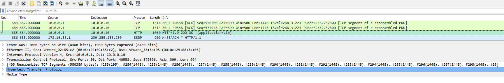 Genom att klicka Arkiv -> Exportera objekt -> HTTP så kan vi exportera alla objekt som blivit nerladdade. Vi drar hem alla filer och kollar igenom dom.